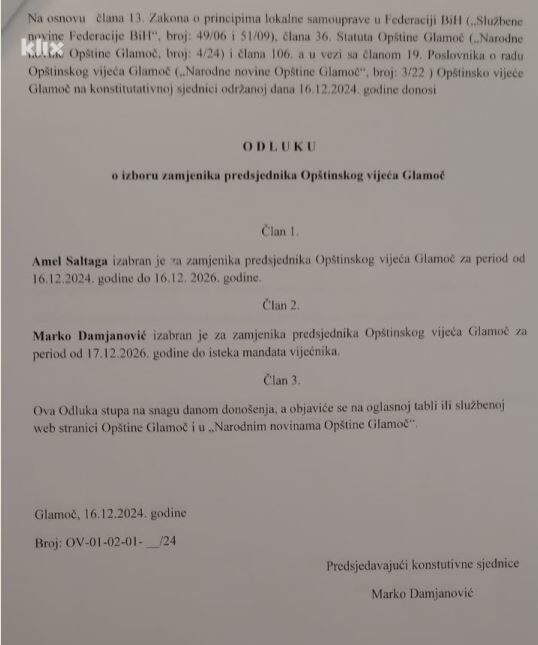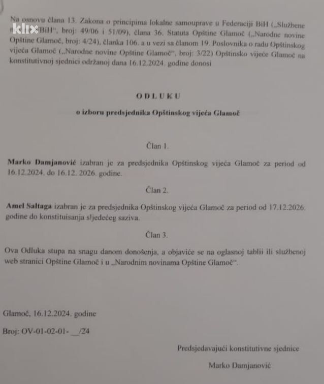 Prvom odlukom o izboru predsjednika Opštinskog vijeća Glamoč, Marko Damjanović (HDZ BiH) će biti predsjednik OV od 16.12.2024. do 16.12.2026. godine, a Amel Saltaga (SDA) od 17.12.2026. do konstituisanja sljedećeg saziva Opštinskog vijeća.