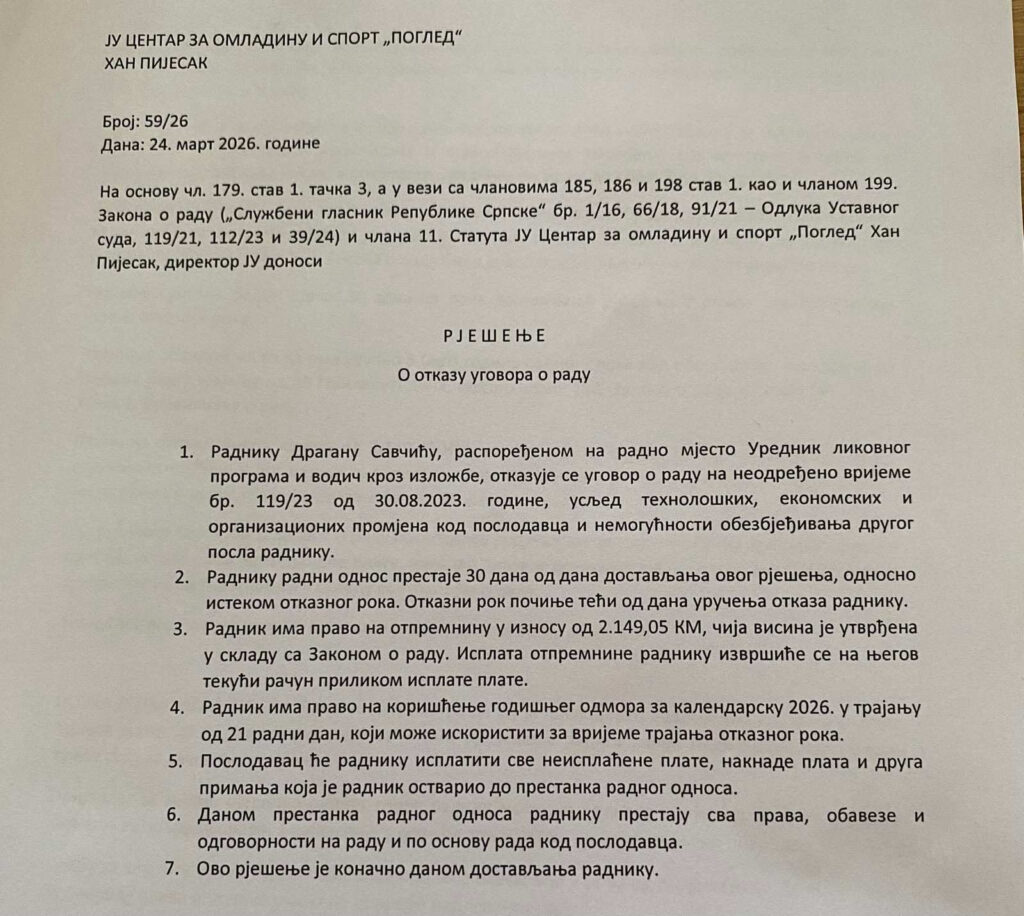 Savčić navodi da je obrazloženje da za njegovo radno mjesto više nema potrebe i da opština nema novca nelogično, ističući da se, budžet ne može spasavati otkazom jednom čovjeku.