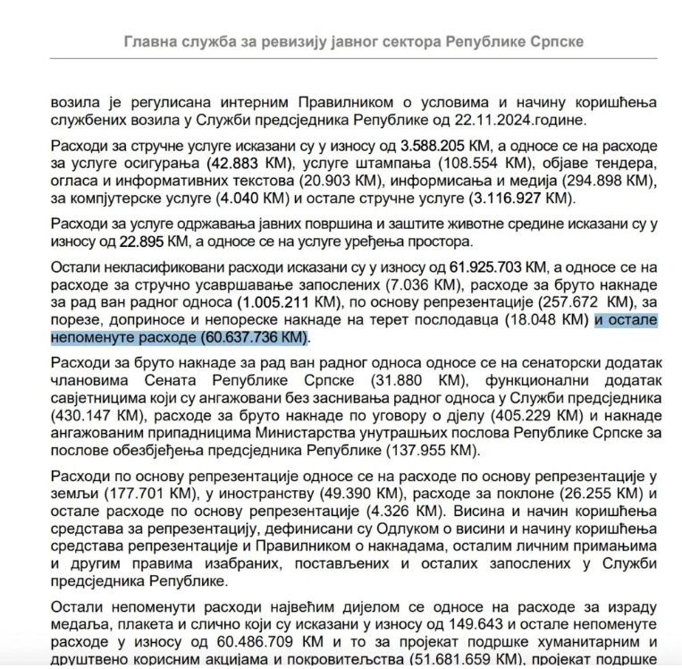 “Rashodi za bruto naknade za rad van radnog odnosa odnose se na senatorski dodatak članovima Senata Republike Srpske (31.880 КM), funkcionalni dodatak savjetnicima koji su angažovani bez zasnivanja radnog odnosa u Službi predsjednika (430.147 КM), rashode za bruto naknade po ugovoru o djelu (405.229 КM) i naknade angažovanim pripadnicima Ministarstva unutrašnjih poslova Republike Srpske za poslove obezbjeđenja predsjednika Republike (137.955 КM)”, istaknuto je u izvještaju.