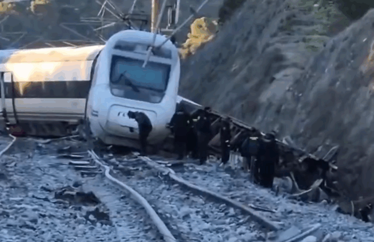 Vozu koji je išao iz Malage prema Madridu odvojila su se posljednja tri vagona i prešla u susjedni kolosijek, a na njih je naletio iz suprotnog pravca voz iz Madrida. Istražioci ispituju tračnice s mjesta nesreće i donji dio vozakojem su izletjeli vagoni.